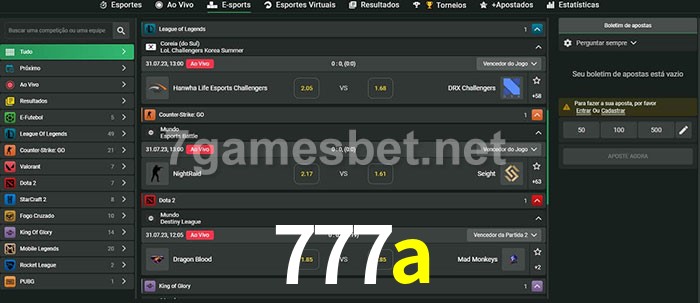 A aposta 777a oferece aos jogadores a experiência mais conveniente de apostas em eSports!